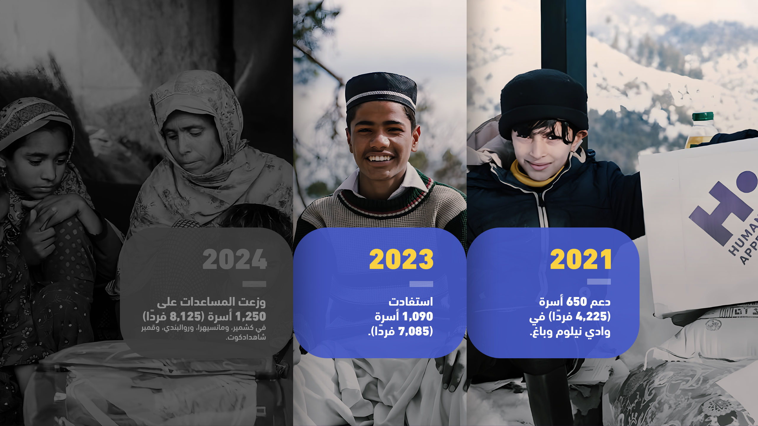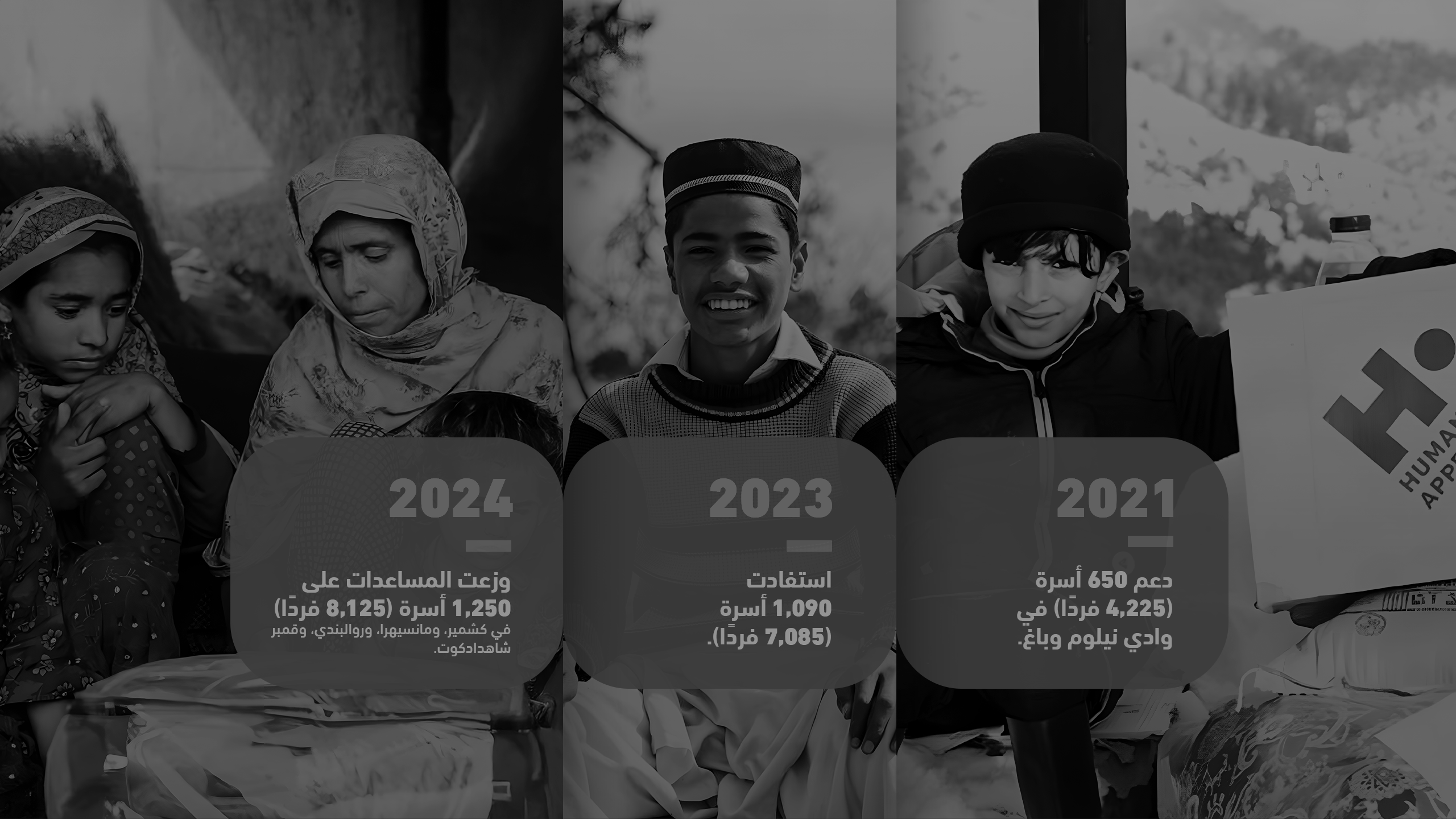 - 2024: وزعت المساعدات على 1,250 أسرة (8,125 فردًا) في كشمير، ومانسيهرا، وروالبندي، وقمبر شاهدادكوت.